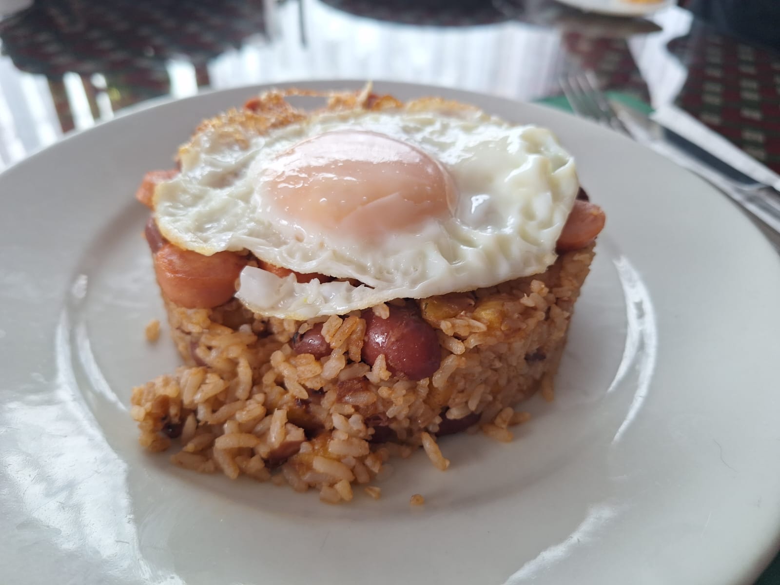 Una mezcla irresistible de arroz con frijoles, salchicha, trozos de maduro y un huevo frito para completar la experiencia.