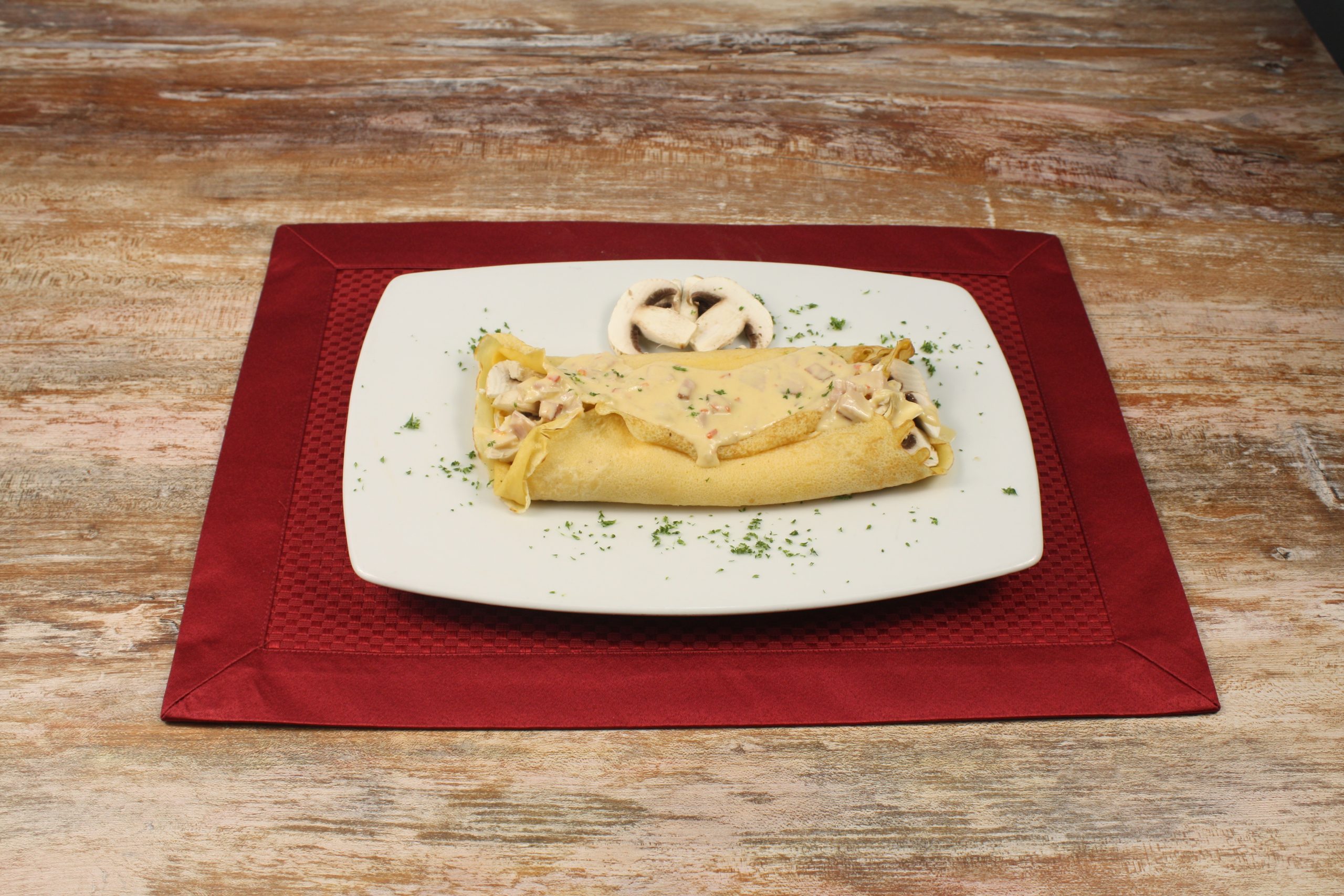 Déjate seducir por la fusión perfecta de la cocina francesa y rusa con nuestro Crepe Stroganoff. Esta suave crepe está rellena con un delicioso estofado de carne de res, cocido a fuego lento en una rica salsa Stroganoff cremosa, que combina champiñones, cebollas caramelizadas y un toque de mostaza y crema. El resultado es un plato elegante y sabroso, ideal para quienes buscan una experiencia culinaria única y llena de sabor.